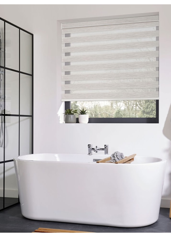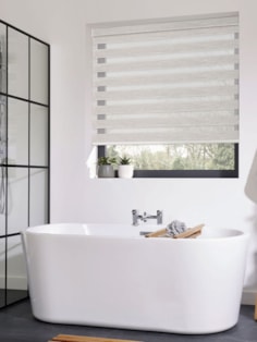 An attractive and innovative solution for many windows, our clever Day and Night blind system works using a looped piece of fabric so that when you raise or lower the blind you can make the alternating sheer and opaque stripes either align or disalign in varying amounts for amazing light control.