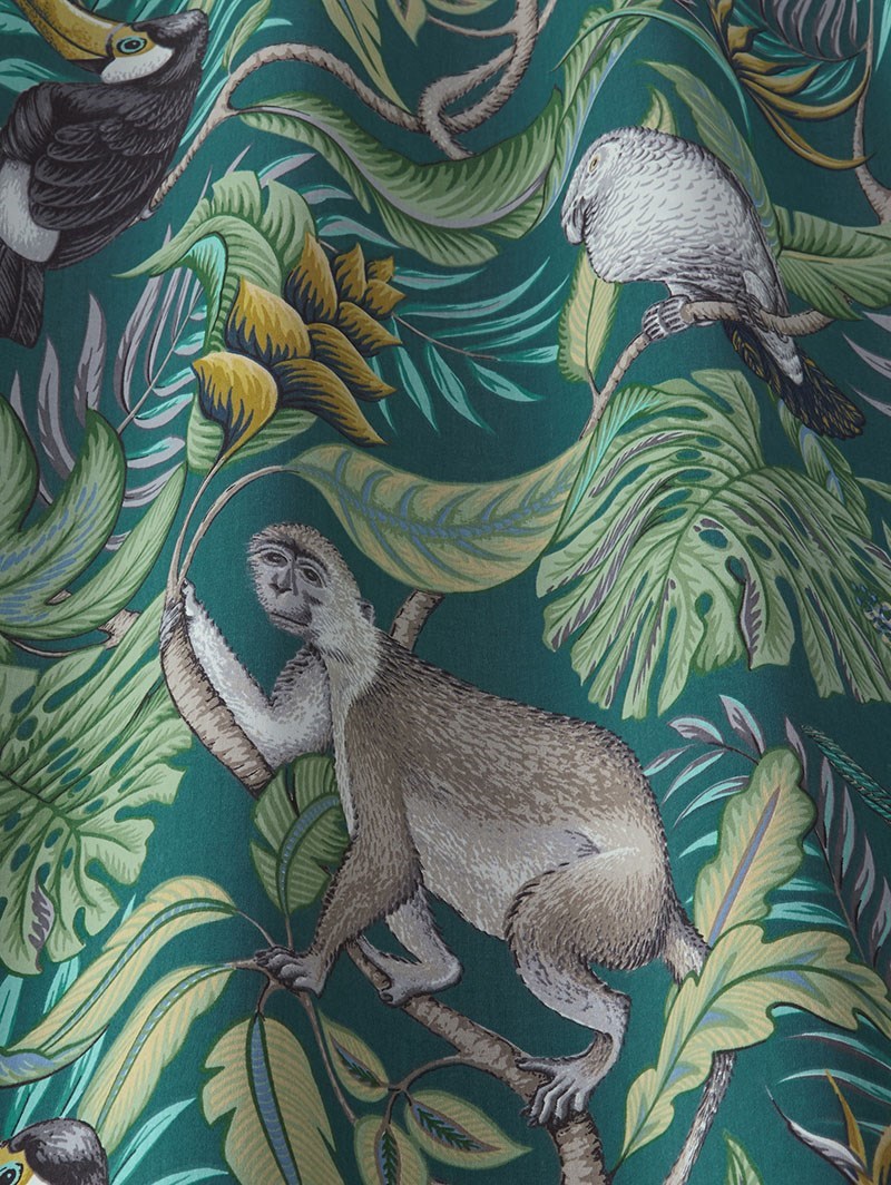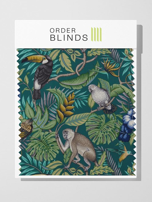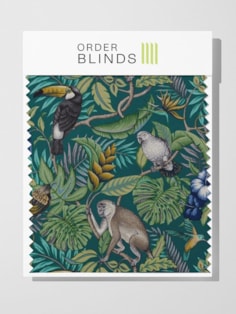 Create a tropical paradise in your space with the Rainforest Lagoon Roman Blind, featuring rich teals and jungle greens. The pattern includes playful monkeys and vibrant tropical birds, adding a burst of natural beauty and exotic charm to your decor.