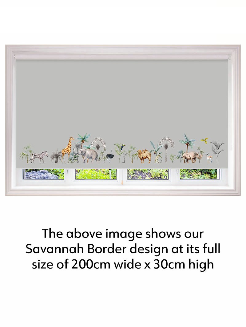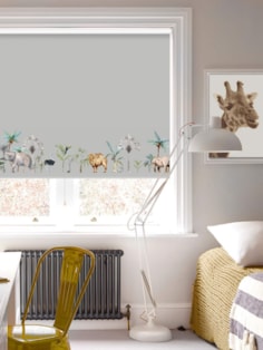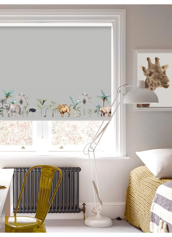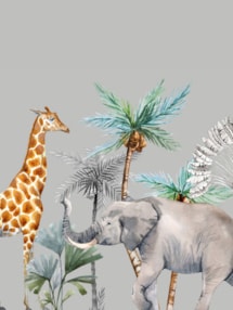Beautifully painted Safari animals stand out against a warm grey backdrop amongst stunning tropical plants and palms. This unique stye combines painterly watercolours with incredibly detailed hand drawn elements and is perfect for all ages. Create subtle interest at your window and add a sense of adventure to your space with this stunning roller blind.