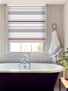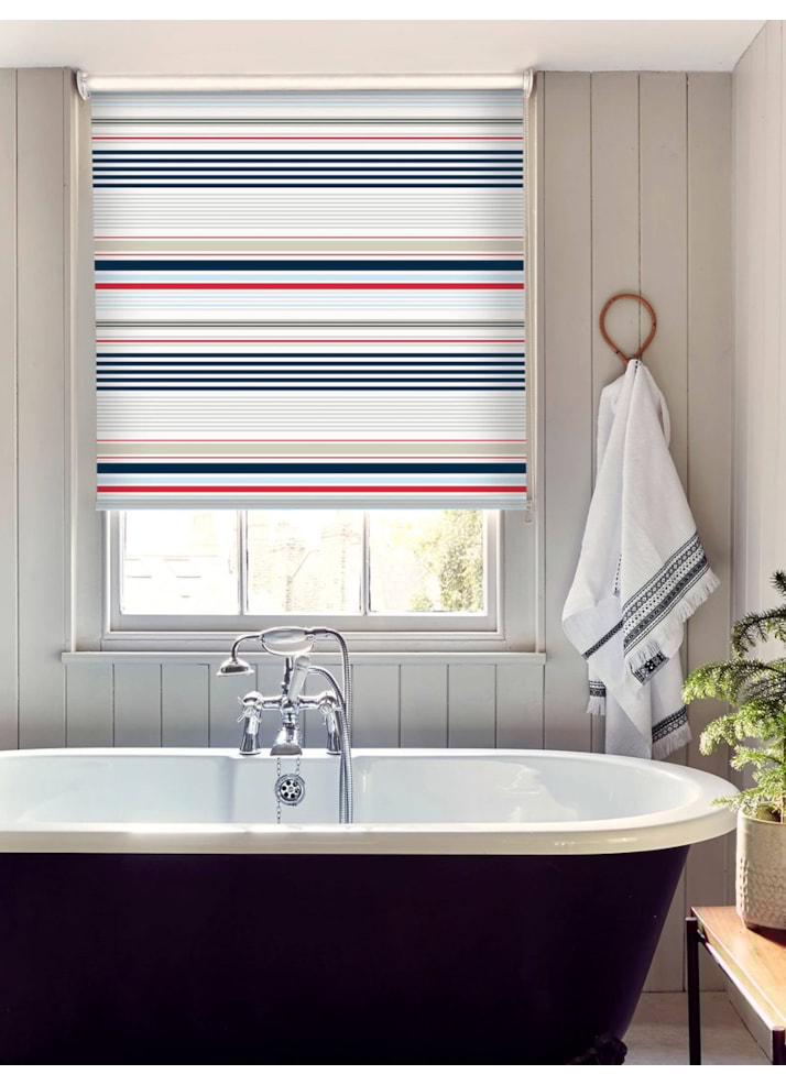 Add a splash of colour to your window with this fun, nautical style sailor stripe. With its bold lines & striking colour palette you can be sure this will create a focal point within your space. Available in two colourways including tones of blue & warm grey or bright red alongside navy, grey & taupe.