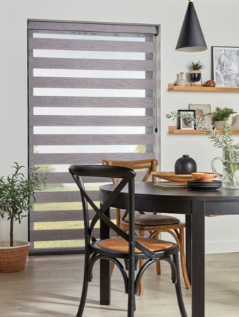 An attractive and innovative solution for many windows, our clever Day and Night blind system works using a looped piece of fabric so that when you raise or lower the blind you can make the alternating sheer and opaque stripes either align or disalign in varying amounts for amazing light control.