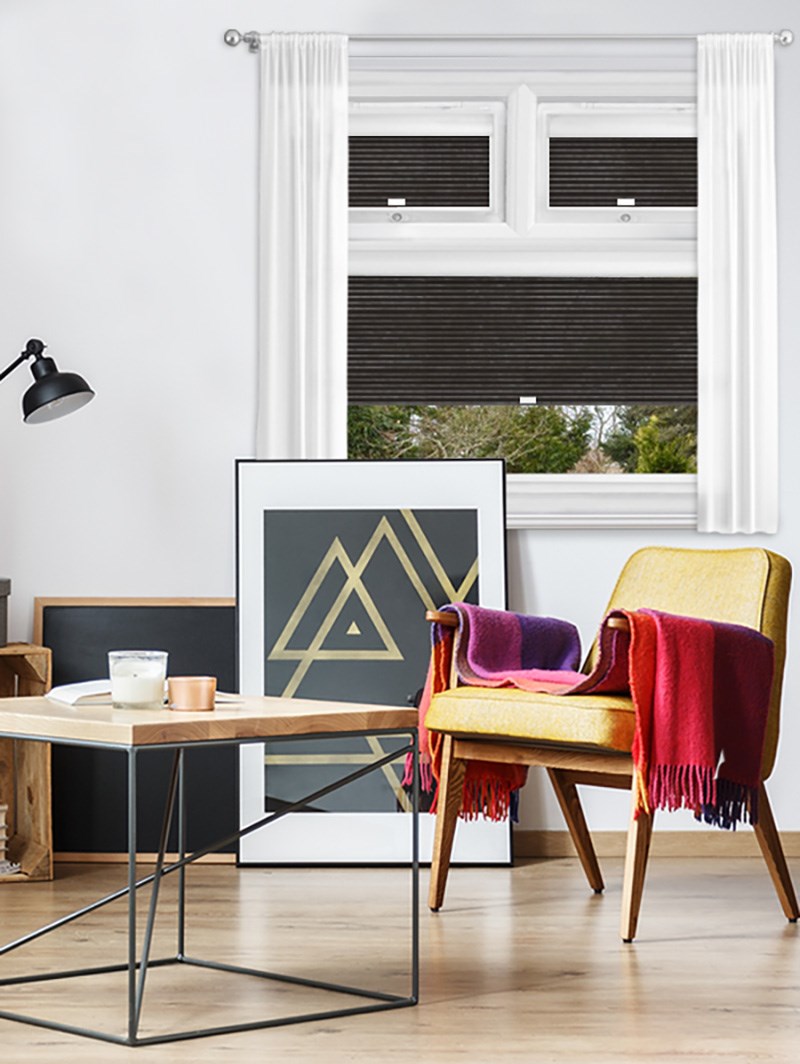 Effortlessly cool and contemporary, these black striped sheer blinds add a little privacy while still allowing in natural light. Simply tilt the base of the blind and pull the handle up or down to raise and lower the blinds to the position you need.