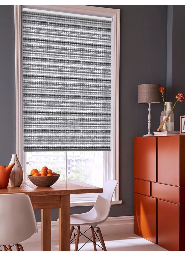 Our deep grey Shibori Stripe design is a beautiful twist on a classic, featuring a painterly brushstroke like texture offset with contrasting white accents. Sure to catch the eye, this versatile roller blind has an unmistakable high end feel and looks beautiful in any room be it a lounge, bedroom, dining room or bathroom.
