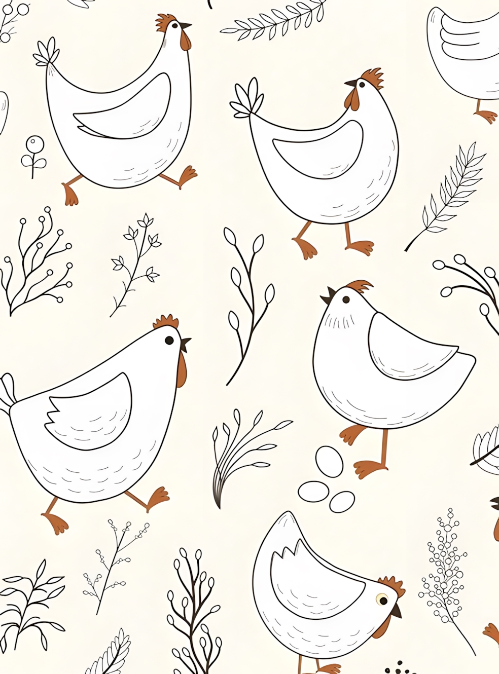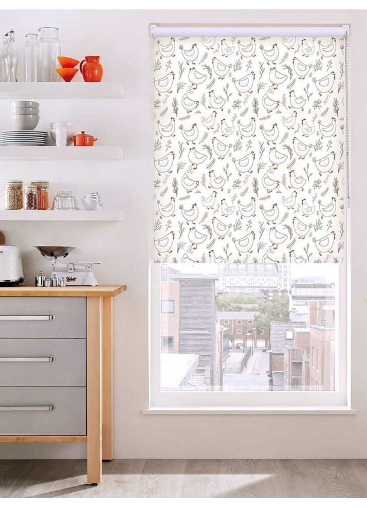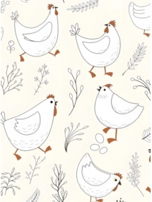 A charming design of hens, eggs and plant shoots on a fresh pale background. Cheerful and bright, it's an attractive choice for a modern or traditional kitchen.