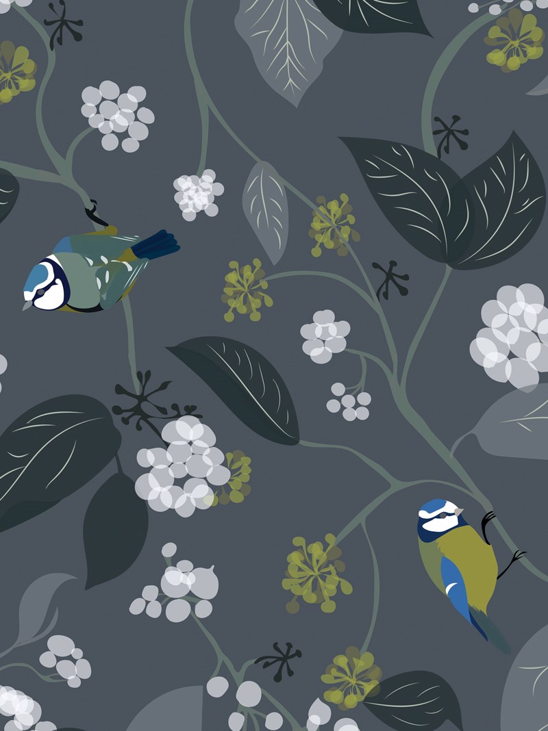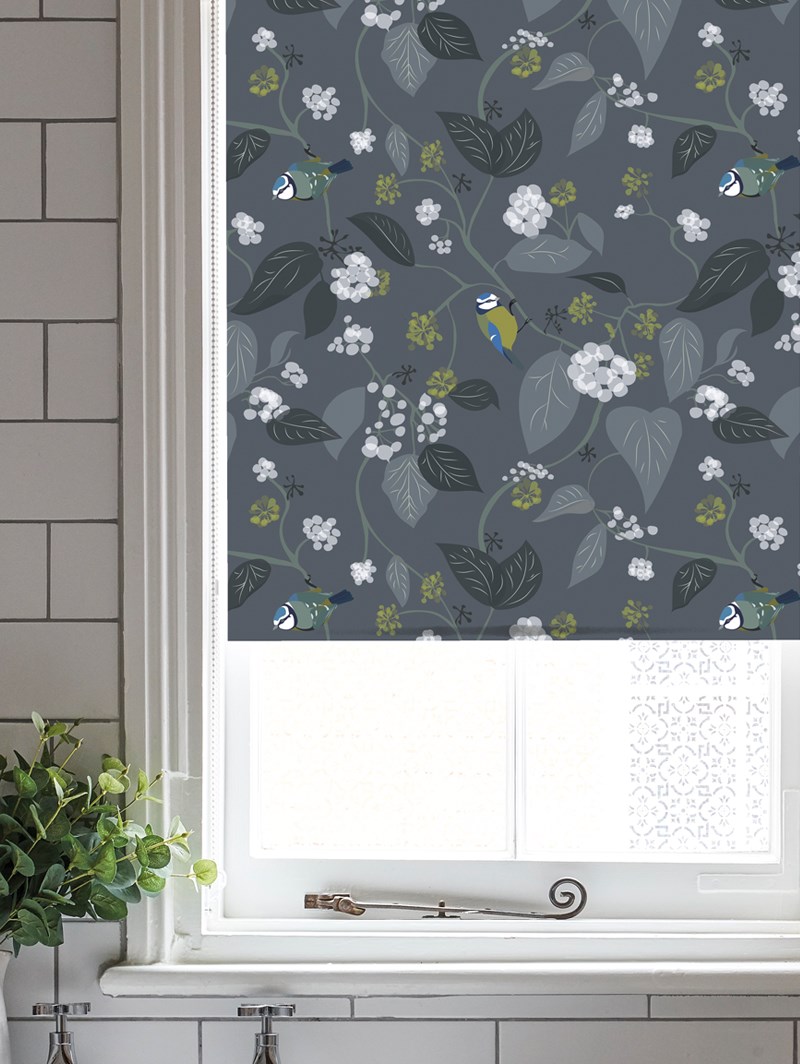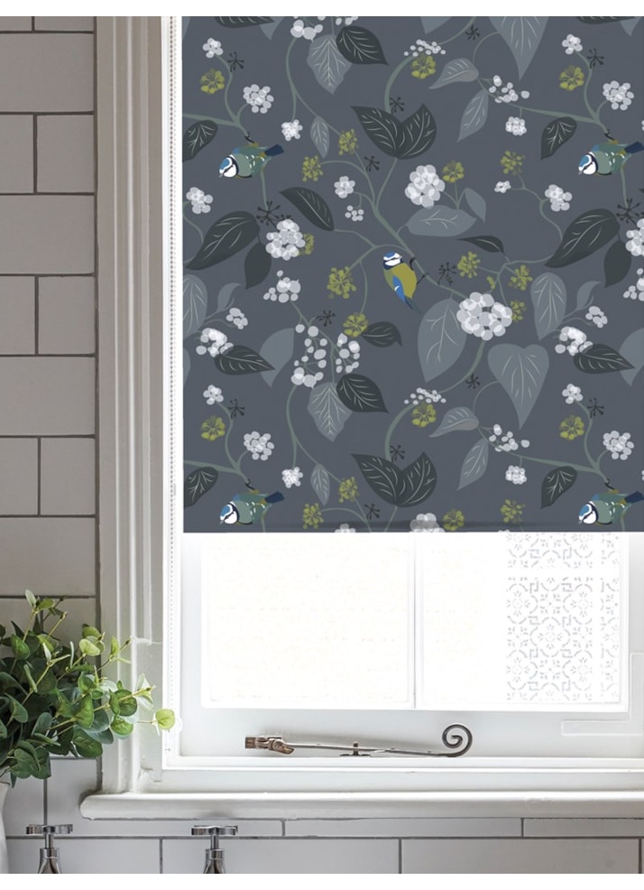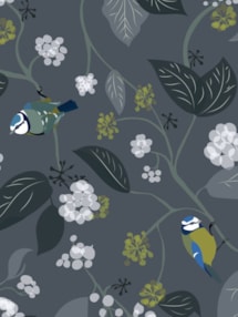 One of our favourite designs, the dramatic graphite greys, bold teals and chartreuse greens create a dramatic effect softened by the print of climbing florals and cheeky berry thieving blue tits. This really is a stunning and eye catching choice.