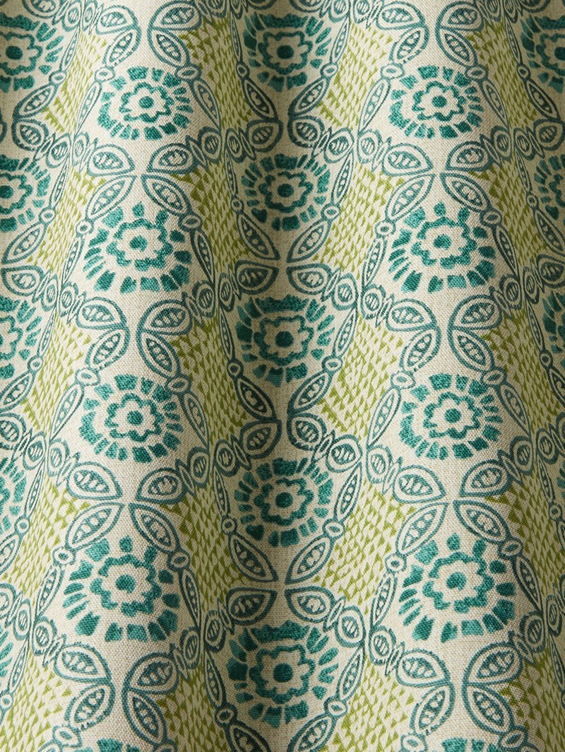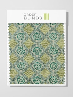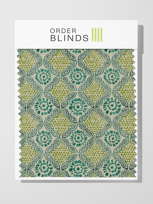Elevate your living space with the Stardust Opal Roman Blind, featuring a contemporary dark beige backdrop adorned with accents of rich jungle green and deep forest green. This Moroccan tile-inspired design adds an exotic touch to your home decor, combining style and sophistication.