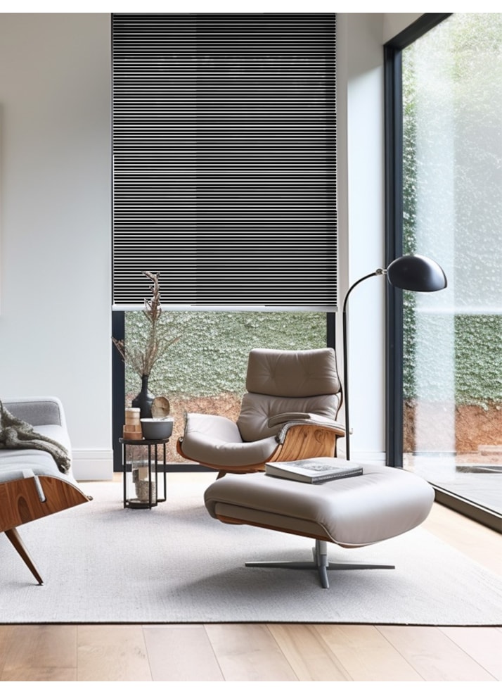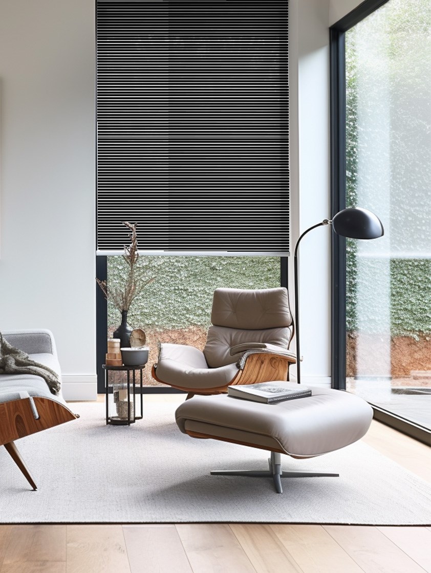 The striking contrast between the semi-sheer and opaque stripes from our Stratus Black sheer roller blind offers a dramatic addition into any room it adorns. The versatile tone of the black pairs effortlessly with countless room colour and decor schemes.