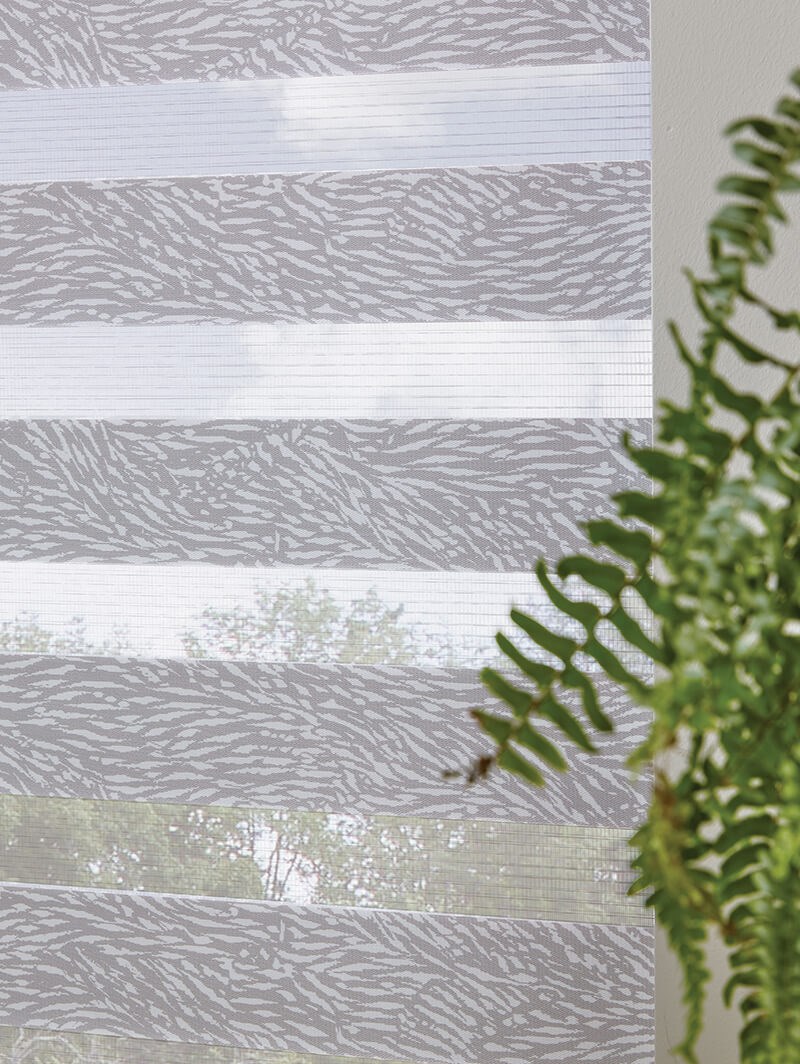 An attractive and innovative solution for many windows, our clever Day and Night blind system works using a looped piece of fabric so that when you raise or lower the blind you can make the alternating sheer and opaque stripes either align or disalign in varying amounts for amazing light control.