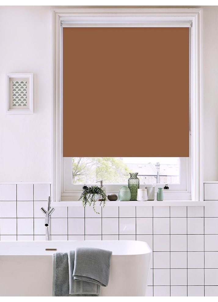 A rich chocolate brown blind may not be an obvious choice for a bathroom but its a great way to create a cosy environment. We love adding green foliage, the perfect match for this warm earthy colour.