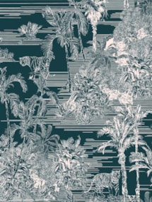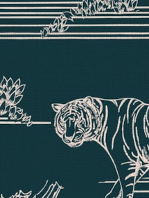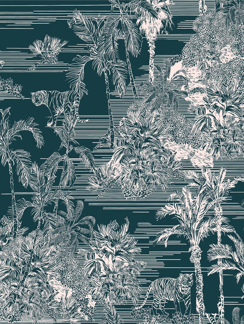 A beautiful background of rich teal is the perfect base for a modern take on toile de juoy that features beautiful tigers stalking through tropical foliage and palm trees. The contemporary colour palette gives a great twist to the classic feel of this wild design.