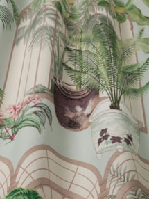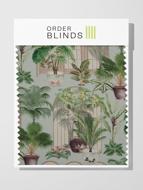 Elevate your interior with the Victorian Glasshouse Mist Roman Blind. The deep duckegg blue background beautifully showcases intricate botanical illustrations of flowering plants, creating a captivating window treatment. This charming design brings a touch of vintage elegance to your living space, adding a sense of timelessness to your decor.