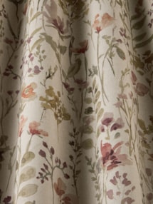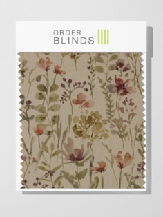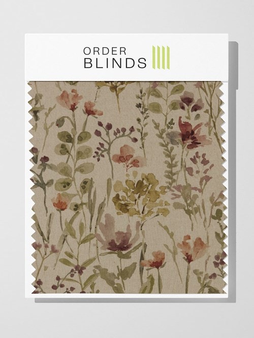 Elevate your living space with the Wild Fields Rosewood Roman Blind. This watercolored flowering meadow pattern, set against a neutral beige backdrop, adds a touch of rustic elegance to any room. The deep sage green splashes, along with hints of washed out purple and red, create a tranquil and inviting ambiance..