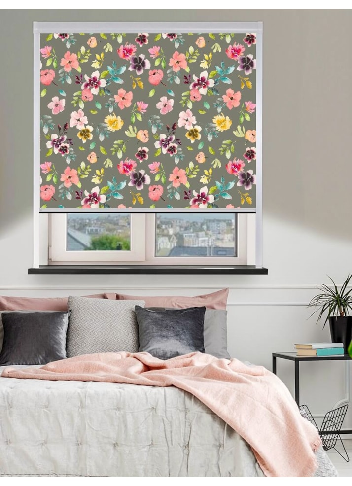 Bright summery blooms stand out from a mid grey background on our Wildflower Dusk Floral Total Blackout Blind creating a beautiful chic and eye catching design. Lovely in any room, we especially love the painterly watercolour style and contrast of dark and light colours.